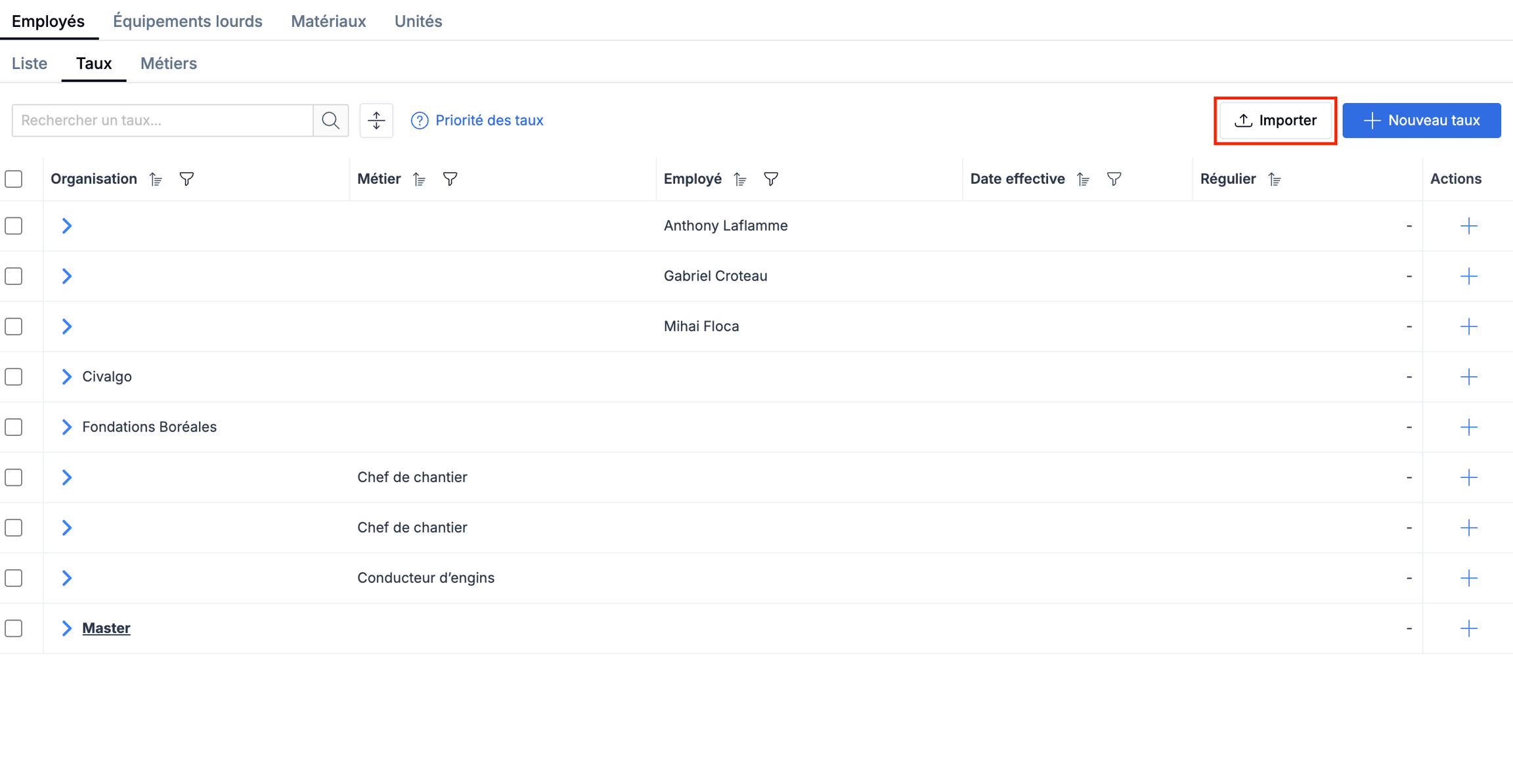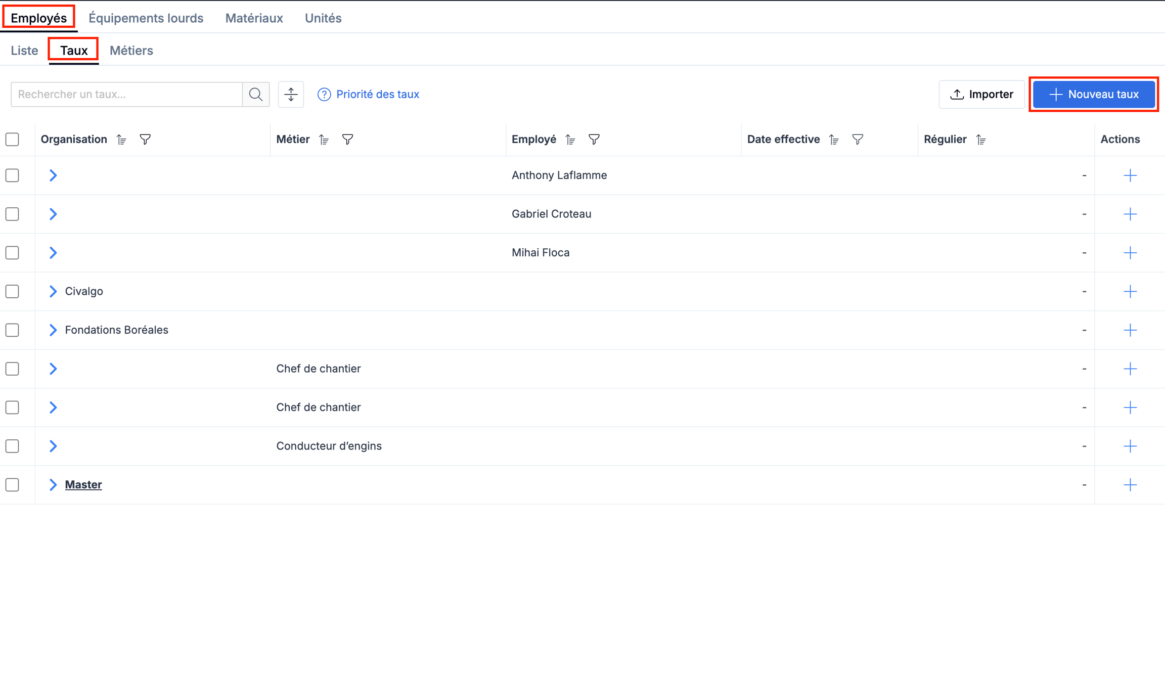 Dans les onglets "Employés", Équipements lourds" ou "Matériaux", cliquez sur le sous-onglet "Taux".