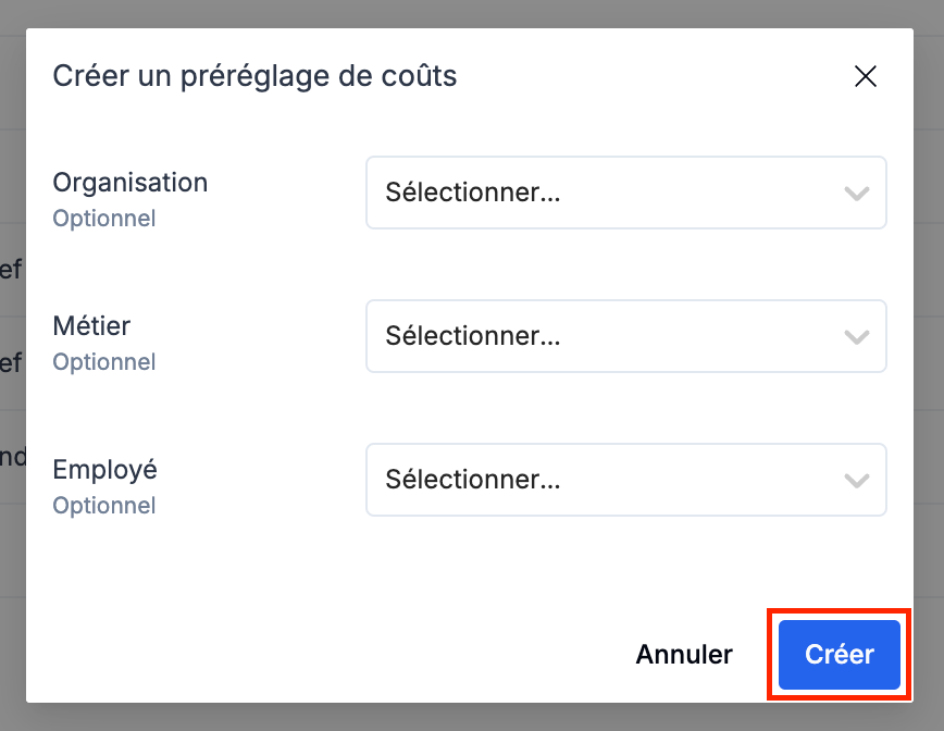 Vous pouvez également entrer des préréglages de taux au niveau du projet. Ces préréglages seront alors prioritaires par rapport aux préréglages globaux. Ils fonctionnent exactement de la même manière.