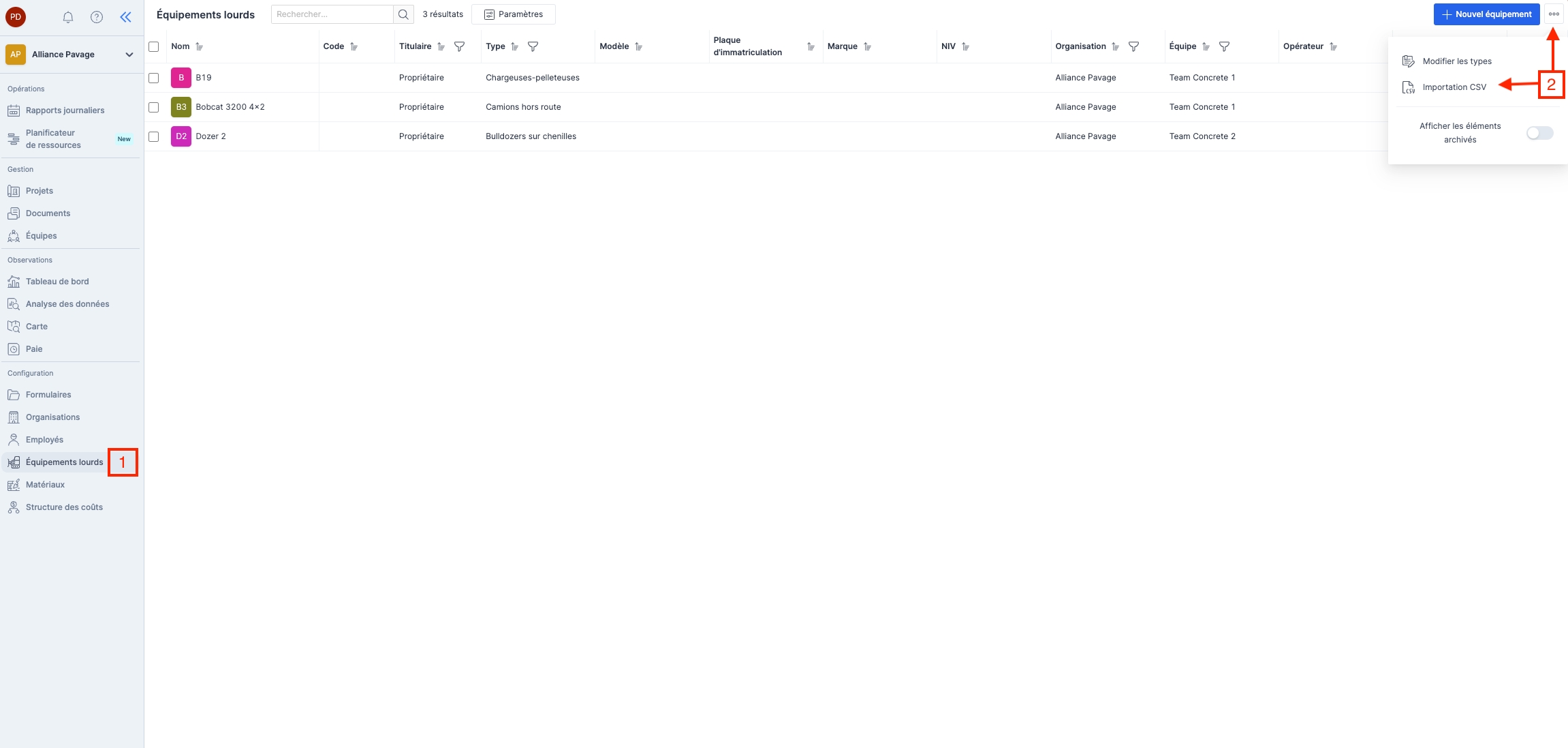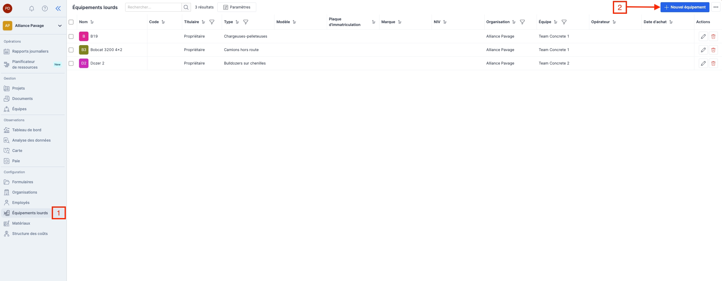 Organization: The equipment that you will track in your daily reports may be the equipment of your subcontractors, so the name of the organization must reflect the owner of this equipment. It allows costs to be assigned automatically based on the organization of the equipment and the type of equipment. Costs will also be sorted according to internal or external resources.