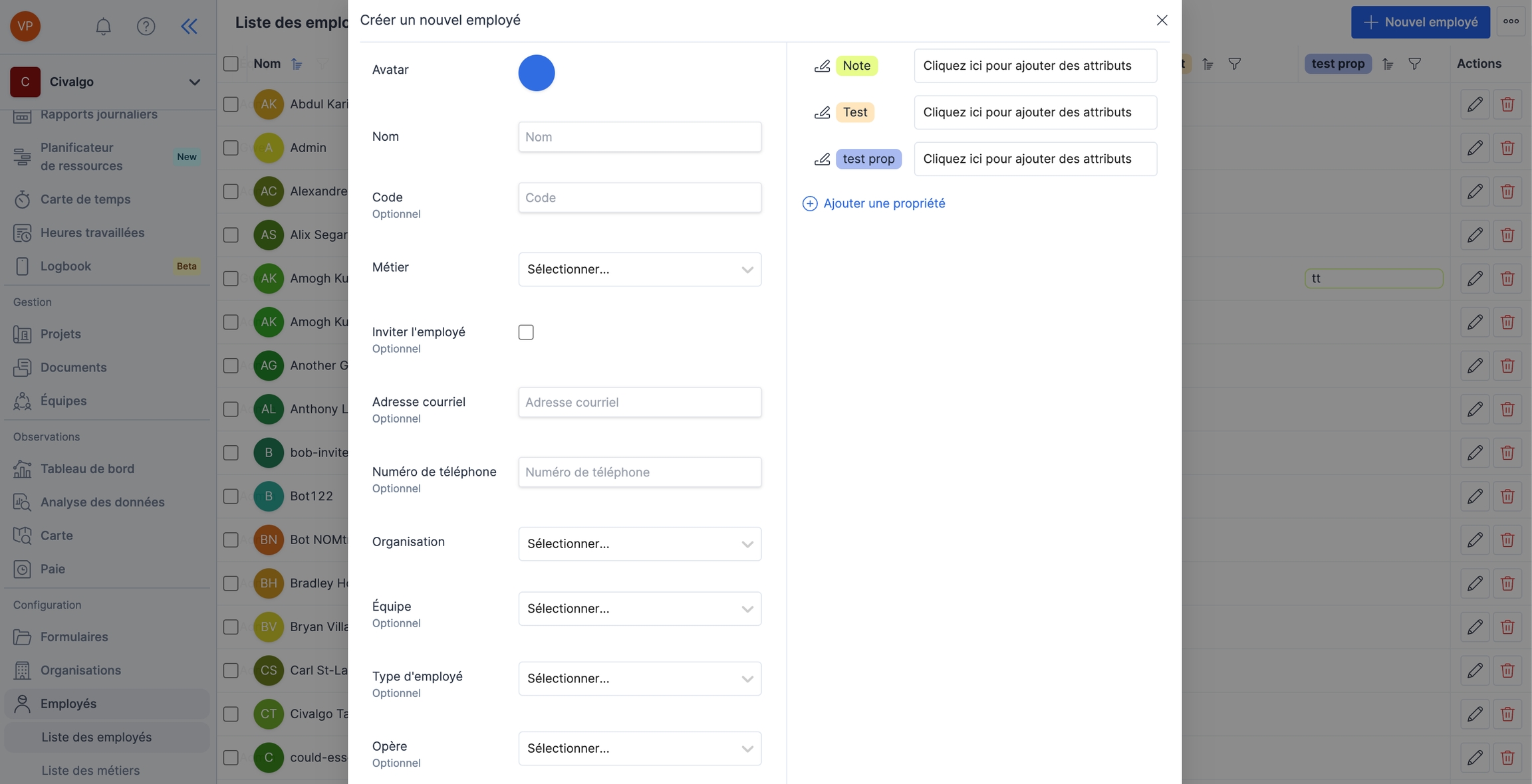 Note that you can do the same for all the properties of your employees, your equipment, your documents as well as the tasks and sub-tasks of your projects.